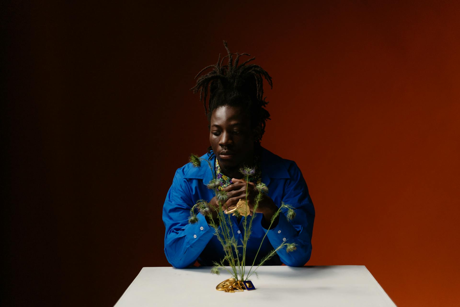 A visually rich composition blending bold color, calm posture, and soft floral texture — a balance of stillness and styling.